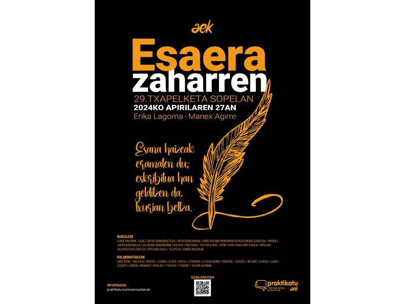 AIZU!-ren aurreko zenbakian aurreratu bezala, apirilaren 27an ospatuko da Sopelan Esaera Zaharren Txapelketaren 29. edizioa, Esana haizeak eramaten du; eskribitua han gelditzen da, txurian beltza lelopean. Parte hartu nahi dutenek bi, hiru edo lau laguneko taldea osatu eta www.praktikatu.eus/esaerazaharrak/ blogean dagoen erreserba fitxa bete behar dute, apirilaren 22a baino lehen. Hortxe aurkituko dute ikasi beharreko 100 esaera zaharren zerrenda ere. Behin eguna iritsita, Sopelako udaletxeko plazan 11:00etan elkartuko dira antolatzaileak, parte hartzaileak, bertsolariak eta goiza musikaz alaituko duten lagunak, txapelketa 11:30ean hasteko. Lehen orduak tabernaz taberna emango dituzte, bertsoak entzun eta, horiekin bat datozen esaerak identifikatu ahala, taldeek aurrera jarraituko duten ala ez erabakitzen. Ondoren, bazkaria izango dute Artadi garagardotegian, eta bertan segituko dute lehian arratsaldean finalaurrekoak eta finala jokatzeko, Erika Lagomaren eta Manex Agirreren bertsoak lagun dituztela. Parte hartzaile guztiek jasoko dute oroigarria, eta beste hainbat sari ere banatuko dira. Informazio gehiago behar izanez gero, 695 774 015 telefono zenbakira edo