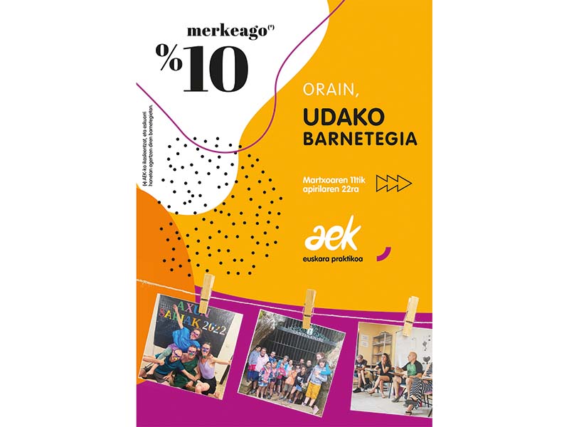 AEK-ko ikaslea zara eta aurtengo udan euskara ikasten eta praktikatzen jarraitzeko asmoa duzu, zeu bakarrik edo sendikoekin? Bada, dagoeneko zabalik dago uda barnetegietako eskaintza berezia AEK-ko ikasleentzat. Izena apirilaren 22a baino lehen emanez gero, % 10eko deskontua izango duzu udan barnetegira joateko. Hori bai, izena ematean, 180 € ordaindu beharko dira aurrematrikula gisa. Aukera oparoa da. Euskalduntze barnetegiak (A2, B1, B2, C1) Hego Euskal Herrian egingo dira, uztailaren 1etik 14ra, uztailaren 15etik 28ra (A2 maila hamabostaldi honetan eskainiko da), uztailaren 29tik abuztuaren 11ra, abuztuaren 12tik 25era (B2 eta C1 mailak, baita maila egiaztatzeko azterketak prestatzeko barnetegiak ere) eta abuztuaren 26tik irailaren 8ra. Familia barnetegiak, berriz, uztailaren 1etik 12ra, uztailaren 15etik 26ra eta uztailaren 29tik abuztuaren 9ra izango dira, B1, B2 eta C1 mailak lantzeko. Informazio gehiago, www.aek.eus atarian, 607 673 541 telefono zenbakian eta/edo Helbide elektroniko hau spambot-etatik babestuta dago. JavaScript gaituta izan behar duzu ikusi ahal izateko. helbidean.