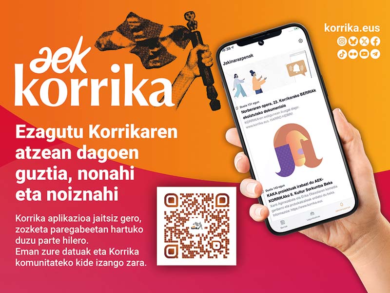 Korrikak bere aplikazioa berritu du, 24. Korrikari buruzko albiste nagusiak, nobedadeak eta informazio garrantzitsuena euskaltzale guztiekin partekatzeko asmoz. Izan ere, aurtengoa Korrikarik gabeko urtea izan arren, AEK eta Korrika dagoeneko buru-belarri dabiltza hurrengoaren prestaketan. Bitartean, Korrika maite dutenen fideltasuna eskertzeko, hilero-hilero zozketa bereziak egingo dira aplikazio berria instalatuta dutenen artean. Lehenengoak abenduan egin ziren, baina oraindik ere aukera asko dago, hurrengo zozketak urtarrilaren 17an, otsailaren 14an, martxoaren 14an, apirilaren 18an, maiatzaren 16an eta ekainaren 12an egingo baitira, hurrenez hurren. Eta zer zozkatuko du Korrikak? Bada, Esne Beltza taldearen azken kontzerturako sarrerak, Korrika katiluak, Berria egunkariarekin batera Korrikaren 44. urteurrenagatik sortutako trixerta, Praktikatu Zerbitzuaren opari kutxa, Malum Rex jatetxerako 50 euroko bonua eta AIZU! aldizkariaren harpidetza digitalak. Parte hartzea oso erraza da: QR kodea eskaneatu eta, behin aplikazio berria jaitsita, nahikoa da horren bidez jasoko duzuen inprimakia betetzea. Badator!