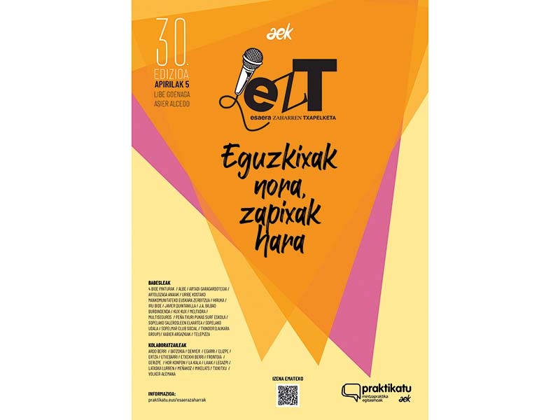 Apirilaren 5ean ospatuko da Sopelan Esaera Zaharren Txapelketaren 30. edizioa. Lehen ediziotzat jo ahal duguna 1992an egin zuten, baina Sopelako Nikola AEK eta Algortako Lauaxeta AEK euskaltegietako bi talderen arteko lehia izan zen, mintzapraktika egiteko antolatutako ekintza berezia baino ez. Ordutik, bilakaera handia izan du Txapelketak: gaur egun, 80-90 lehiakide inguru erakartzen ditu Sopelara, eta egun-pasa ederra bihurtu da. Sopelako kaleetan euskararen presentzia bermatzeaz gain, ALBE Algortako bertso eskolako bertsolarien, AEKko kideen, lehiakideen, musikarien eta epaileen artean 100ndik gora lagun elkartzen ditu, goizean hasi eta iluntzean amaitu arte, Artadi garagardotegiko bazkarian atseden hartuta. Hala izango da aurtengoan ere, baina edizio berezia izanik, beste hitzordu batzuk antolatu dituzte Txapelketaren aurreko eta osteko egunetarako: martxoaren 24an, Esaera Zaharren Txapelketa, 30 urte erakusketa inauguratuko da, Sopelako Kurtzio kultur etxean. Apirilaren 3rako, kalejira eta kantu-poteoa antolatu dituzte, Sopela Kantari taldearen eskutik; eta, apirilaren 4an, umeentzako disko-festa udaletxeko plazan (euria bada, Zipiriñe eskolako jolastokian). Egun nagusia igarota, apirilaren 10ean Esalegeak gurean hitzaldia eskainiko dute Akaitze Kamiruagak eta Iñaki Gilisastik; eta, azkenik, maiatzaren 20an, Adolfo Arejita euskaltzainak esaera zaharren gaineko hitzaldia emango du. Biak ala biak, Kurtzio kultur etxean.