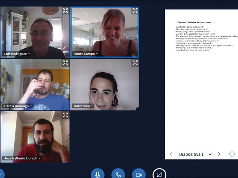 Hiru gairi buruz hitz egin zuten, 45 minutuko bina saiotan eta bospasei laguneko taldetan banatuta: gazteak eta helduak, oporrak eta turismoa, eta sare sozialak. Oro har, egunerokotasuna duten gai errazak aukeratzen dituzte, inor ez dadin berba egin barik geratu.