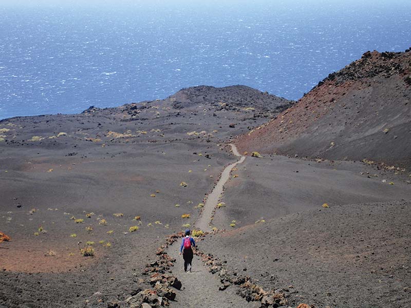 Egunsentian Roque de los Muchachoserainoko bidea egin dugu, La Palmako gailurrerainokoa, alegia, eta gero, 2.423 metrotik itsasorainoko jaitsiera amaigabeari ekin diogu. Lurrak karraska egiten du boten azpian, mendi sortu berri baten errautsak zapaltzen ari garelako.