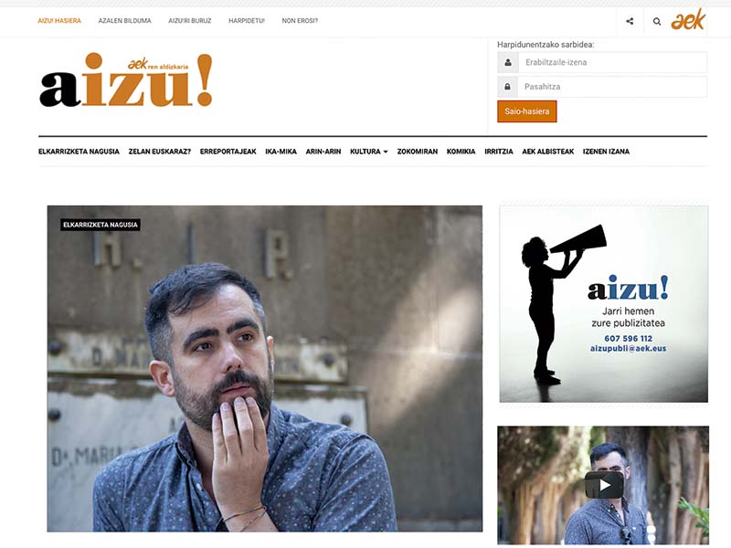 Ikasturte berrian, webgune berritua. Halaxe dator AIZU!ren ataria. Gunearen itxura aldatu egingo da, eta aukera berriak eskainiko ditu. Adibidez, aurrerantzean, AIZU!ren harpidetza egiteko hiru modu izango dira: harpidetza arruntaz gain, harpidetza digitala edota digitala eta paperezkoa uztartzen dituena. Harpidetza digitalarekin, hileroko zenbakia e-postaz jasoko da. Digitala eta paperezkoa egiten duenak, berriz, paperezko zenbakia postontzian eta zenbaki digitala e-postaz jasoko ditu, eta aizu.eus-eko harpidedunen txokoan zenbaki zaharrak ere ikusi ahal izango ditu. Hala, AIZU!ren eduki guztiez gozatzeko, harpidetza paperean edo digitalean egitea ezinbestekoa izango da, edota kioskoan zenbakia eskuratzea. Bestalde, zenbait eduki berri izango ditu webguneak, hala nola, orain artean soilik paperean argitaratzen zen Izenen izana atala edota argazki galeria. Paperezko zenbakiko hileroko lehiaketa ere webgunetik bideratuko da. Gainera, pixkanaka, berrikuntza gehiago gehituko zaizkio webguneari. Paperezkoa eta digitala elkarren osagarri izan daitezen.