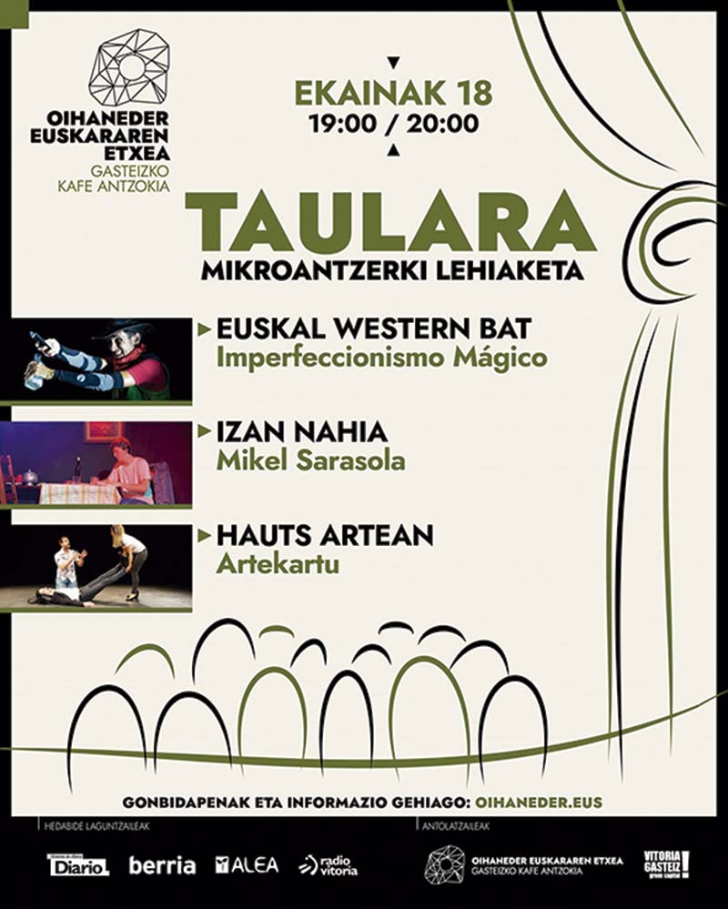TAULARA lehiaketa antolatu du, bigarren aldiz, Gasteizko Oihaneder Euskararen Etxeak, euskarazko antzezlan laburren sormena sustatzeko asmoz. Euskal Herri osoko antzezle, talde eta sortzaileei eskainia, bi kategoria izango ditu: jatorrizko gidoi onena sarituko duena eta jatorrizkoak izan gabe 2020tik aurrera sortutako gidoiei erreparatuko diena. Guztira, 3.500 euro banatuko dituzte lau saritan. Lanak urtarrilaren 24ra arte aurkez daitezke. Xehetasun guztiak oihaneder.eus gunean daude.