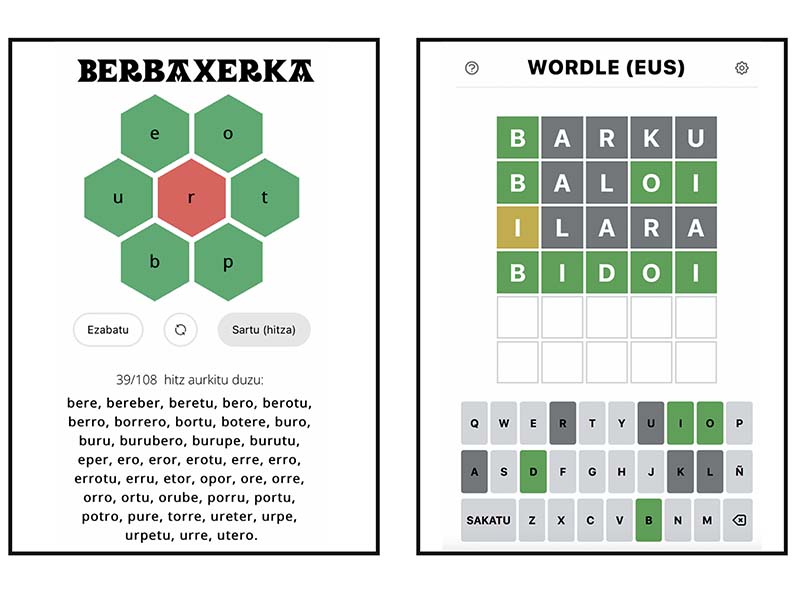 Urte berriarekin batera, arrakasta handiz zabaldu dira sareetan bi jolas: Berbaxerka eta Wordle. Biak hitz jokoak izanik, ondo pasatzeko ez ezik, euskara lantzeko ere egokiak dira. Berbaxerkan (https://berbaxerka.gitlab.io/), 7 hizkirekin ahalik eta hitz gehiena sortu behar dira. Egunero, 7 hizki ematen ditu jolasak, bat nabarmendua. Hori derrigor erabilita, gainerakoekin elkartu behar da ahalik eta hitz gehiena osatzeko. Ondoren, hitz bakoitzaren definizioa ere ikus daiteke, gainean klik eginda. Katalanezko Paraulogic jolasaren euskarazko bertsioa da (jatorrizkoa ingelesezko Spelling Bee da). Berria kazetan azaldu zutenez, Marc Font programatzaileak eta Gorka Salces irakasleak ekarri dute euskarara. Wordle jokoan, berriz, egunero 5 hizkiko hitza asmatu behar da, sei saialditan. Ekinaldi bakoitzean, letra bakoitzaren koloreak esango digu hitza asmatzetik hurbil ote gauden. Ingelesez arrakasta izan ostean, Talaios enpresak euskaratu du: https://wordle.talaios.coop/.