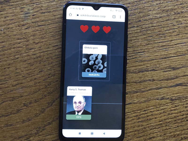 SAREAN EUSKARAZ jokatzeko aukera handitu du Talaios Kooperatibak, Wikitrivia jokoa euskaratuta. Funtzionamendu erraza du: jokoak proposatzen dituen historiako gertakariak denbora lerro batean kokatu behar dira, kronologia asmatuta. WordlEH eta Berbaxerka ez bezala, Wikitrivian nahi adina aldiz joka daiteke egunean. Hori bai, partida bakoitzean hiru huts egin daitezke gehienez. Helbide honetan joka daiteke: wikitribia.talaios.coop/.
