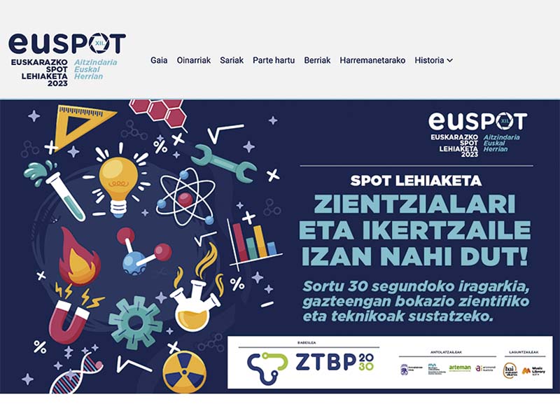 ZIENTZIALARI eta ikertzaile izan nahi dut! Gai horri heldu beharko diote 2023ko Euspot euskarazko spot lehiaketan parte hartzen duten iragarkiek. Zehazki, gazteen artean bokazio zientifiko eta teknikoak sustatzeko spotak izan beharko dute. Telebista konbentzionaletan edo sare sozialetan zabaltzeko ikus-entzunezko iragarkiak egin beharko dituzte parte hartzaileek, euskaraz, eta gehienez 30 segundoko iraupena dutenak. Informazio guztia euspot.eus atarian ikus daiteke.