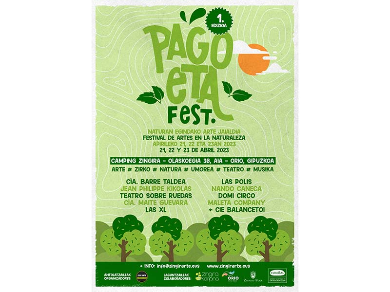 APIRILAREN 21ean, 22an eta 23an, Pagoeta Fest jaialdia egingo da, lehen aldiz, Aiako Zingira kanpinean. Pagoeta Natura Parkearen aldamenean egonik, artea naturan eskainiko du jaialdiak. Hiru egunetan ikuskizunak, kontzertuak, jokoak, instalazio artistikoak eta ibilaldi eszenikoak eskainiko dituzte. Euskal Herriko taldeek ez ezik, Espainiako, Frantziako eta Kataluniako konpainiek ere parte hartuko dute jaialdian. Informazio guztia www.zingirarte.eus webgunean eskura daiteke.