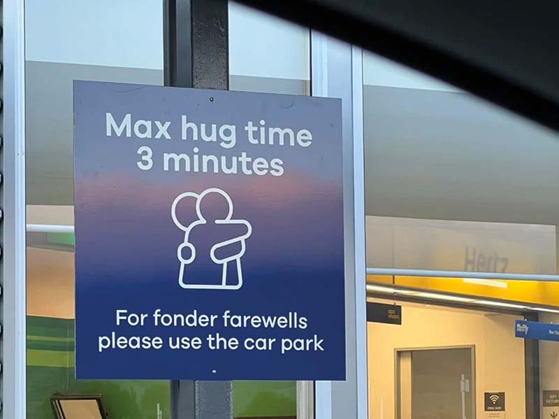 Neurri bitxia hartu dute Dunedin hiriko (Zeelanda Berria) aireportuan, sarreran sortzen diren jende pilaketak saihesteko: agurtzeko besarkaden iraupena murriztu dute. Zehazki, aireportuko atarian jarri duten kartel batek zera dio: “Besarkadak hiru minutukoak, gehienez. Agur maitekorragoak egiteko, erabili aparkalekua”. Beste batek, hauxe: “Agur esatea zaila da, hortaz, egizu azkar. Asko jota, hiru minutuan”. Zeelanda Berriko bosgarren aireporturik garrantzitsuena da Dunedingoa (Momonako aireportua izenez ere ezaguna), urtean milioi bat bidaiari inguru igarotzen dira bertatik. Antza, aireportuko sarreran askotan sortzen dira pilaketak, jendea asko luzatzen delako elkar agurtzen. Horregatik erabaki dute agurren iraupena mugatzea. Aireportuko bidaiarien artean auskalo, baina mundu zabalean, behintzat, oihartzuna izan du neurriak. Batez ere, bidaiari batek sare sozialetan kartelen argazkia zabaldu zuenetik.