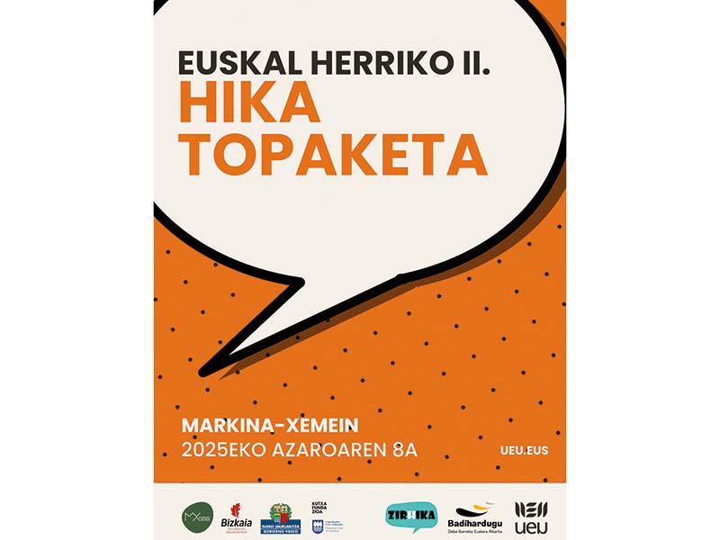 Euskal Herriko II. Hika Topaketa egingo dute, azaroaren 8an, Markina-Xemeinen. UEU Udako Euskal Unibertsitateak, ZirHika mugimenduak eta Badihardugu euskara elkarteak antolatu dute elkarlanean, eta saretzea izango du helburu nagusi. Hau da, hitanoa1 biziberritzeko lanean ari diren eragile eta taldeek elkar ezagutzea, indarrak batzeko eta elkarlanerako bideak sor ditzaten. Egun osoko topaketan, Euskal Herrian hitanoa bultzatzeko egitasmoak eta esperientziak ezagutaraziko dituzte hitzaldi, mahai-inguru eta lan mahaien bitartez. Hain zuzen, helburu horrekin egin zen, duela bi urte Oñatin, I. Hika Topaketa. Hitzordu2 hartan jaio zen ZirHika mugimendua, hango eta hemengo taldeak eta eragileak batuta. Oraingoan, tokian tokiko3 egoerak ezagutzeaz gain, aurrera begira egin daitezkeenak ere jorratuko4 dituzte. Topaketa amaitzeko, bertso saio irekia izango dute. Izena UEUren webgunean (https://www.ueu.eus) eman daiteke.