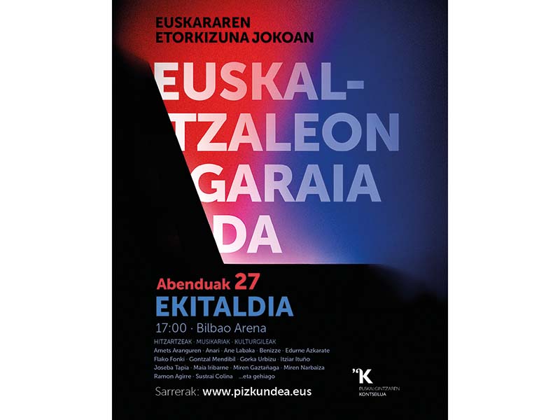 Larrialdi linguistikotik indarraldira1 igarotzeko bidean, abenduaren 27an euskararen aldeko hitzordu berezia egingo du Euskalgintzaren Kontseiluak Bilbon: Euskaraz bizitzeko Pizkundea2 lelopean, milaka euskaltzale bildu nahi ditu Bilbao Arenan, euskarari arnasa emateko asmoz. Horrenbestez, hainbat musikari eta kulturgile ariko dira ekitaldian, kultura eta aldarrikapena uztartuz: Anari, Gorka Urbizu, Itziar Ituño, Ramon Agirre, Ane Labaka... Kontseiluak hiru arrazoi nagusi azaldu ditu Bilbao Arena euskaltzalez betetzeko. Lehenik, euskaltzaleen indarra eta batasuna agerian uztea. Bigarrenik, euskararen normalizazioa eta biziberritzea3 gizarte osoaren ardura dela jakinaraztea. Azkenik, erakundeei zein eragileei hizkuntza politiketan jauzi sendo eta premiazkoa4 bultzatzeko beharra azpimarratzea. Ekitaldirako sarrera www.pizkundea.eus webgunean erosi ahal da, 10 euroan. Jasotako dirua artistei eta ekitaldiko gastuak ordaintzeko erabiliko da.